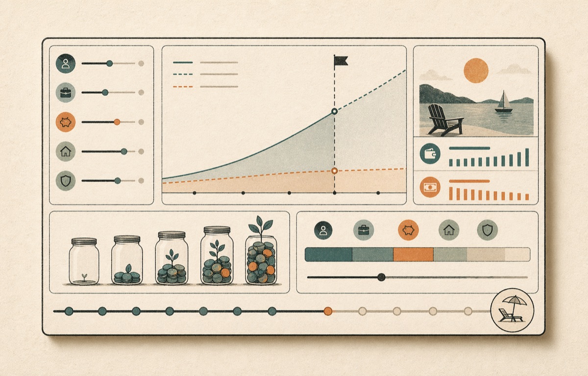 Interactive retirement simulator for estimating long-term savings growth and monthly income.