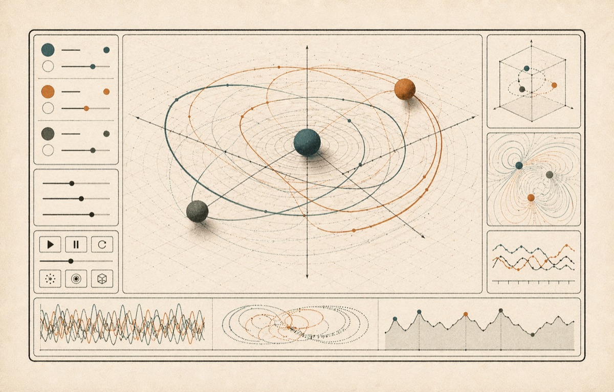 Interactive three-dimensional gravity simulation for chaotic multi-body orbital dynamics.